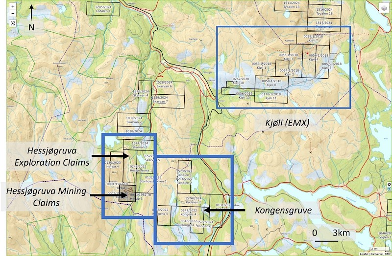 The adjacent Kongensgruve claim blocks were staked by Capella and contain four known former copper mines (Rødalen, Kongensgruve, Fjellsjøen, and Muggruva) in addition to a former mineral processing facility and tailings dam at Kongensgruve.