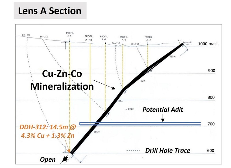Figure 5. Section showing high-grade copper-cobalt-zinc mineralization in Lens A (source: Geometric and Qualimetric Modeling of the Hessjø deposit; Nørsett, S.J. 2016; NTNU M.Sc. Thesis). Location of a potential future adit to access high-grade mineralized zones is also shown.
