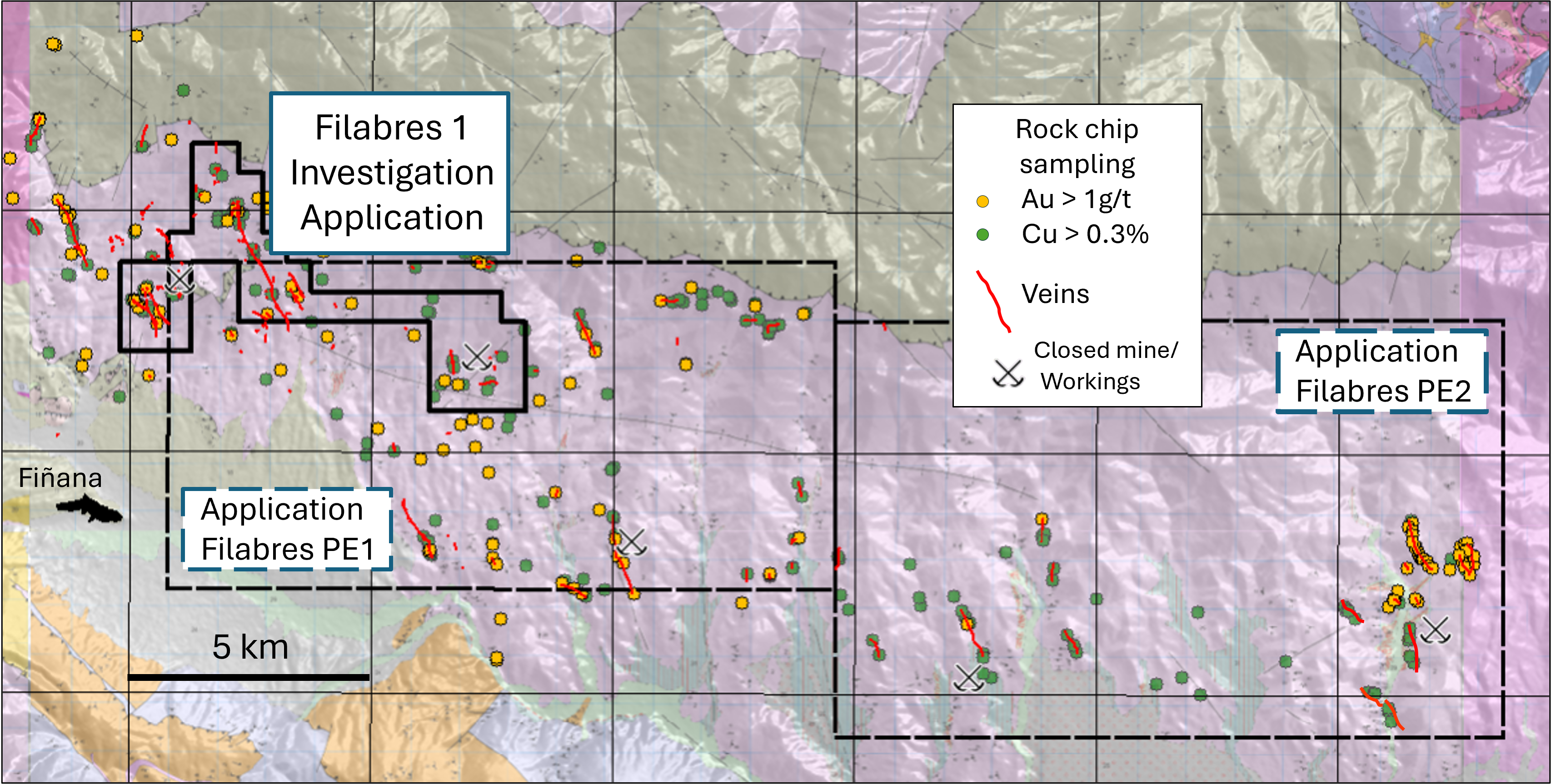 Figure 3. Filabres 1 Investigation Permit and Filabres PE 1 & 2 Exploration Permit applications with mapped haematite-rich copper-gold veins and copper and gold assays at the Solana Project.